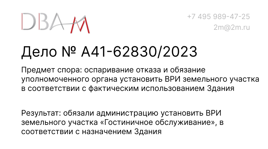 Таким образом, благодаря разработанной судебной позиции суды всех инстанций по делу №А41-62830/23 удовлетворили заявленные требования собственника: Клиенту удалось установить ВРИ участка «Гостиничное обслуживание».